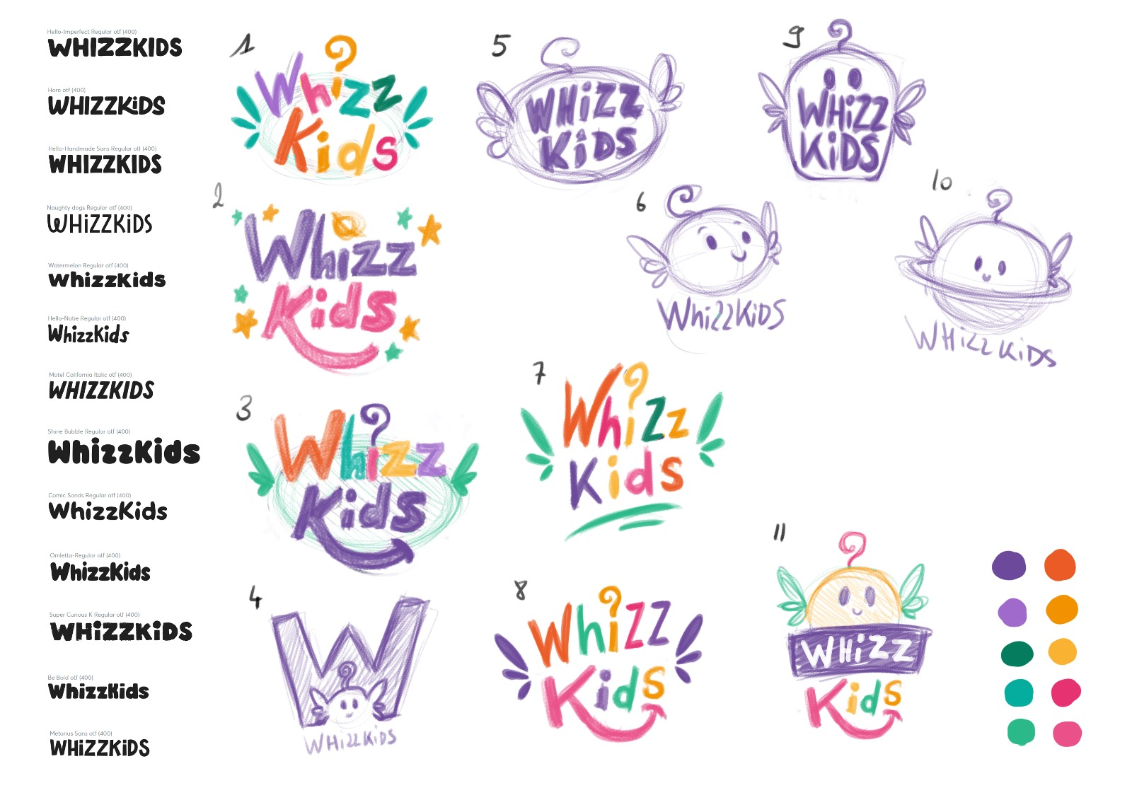 Since they were busy brainstorming a new name, I got to work on some new logo sketches. I offered a wide variety of fonts to choose from, along with a fun new color palette featuring bright colors for kids. The sketches mainly focused on the “Whizzies,” as they could become the new recognizable faces of Whizzkids.